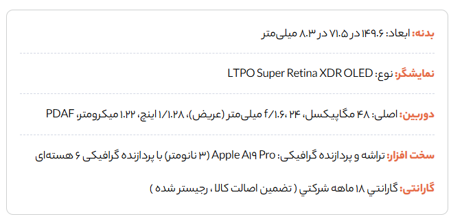 پردازنده | A19 Pro (3nm) | A18 (4nm) | A19 Pro (3nm) | A19 Pro (3nm) | A19 Pro (3nm) | Snapdragon 8 Gen 3 |