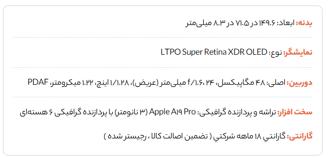 پردازنده | A19 Pro (3nm) | A18 (4nm) | A19 Pro (3nm) | A19 Pro (3nm) | A19 Pro (3nm) | Snapdragon 8 Gen 3 |